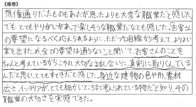 私は将来、建築系に進みたいと思っていたので実際にお話を聞けて良かった。建築でも色々な資格や分野があるのでどんな違いがあるのか気になっていたので少し知ることができていい機会になったと思う。